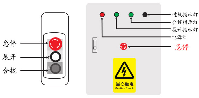 注:手柄開(kāi)關(guān)使用方法為點(diǎn)動(dòng)。長(zhǎng)按展開(kāi)按鈕即可展開(kāi),當(dāng)看臺(tái)徹底展開(kāi)時(shí)觸碰到限位開(kāi)關(guān)會(huì)自動(dòng)停止